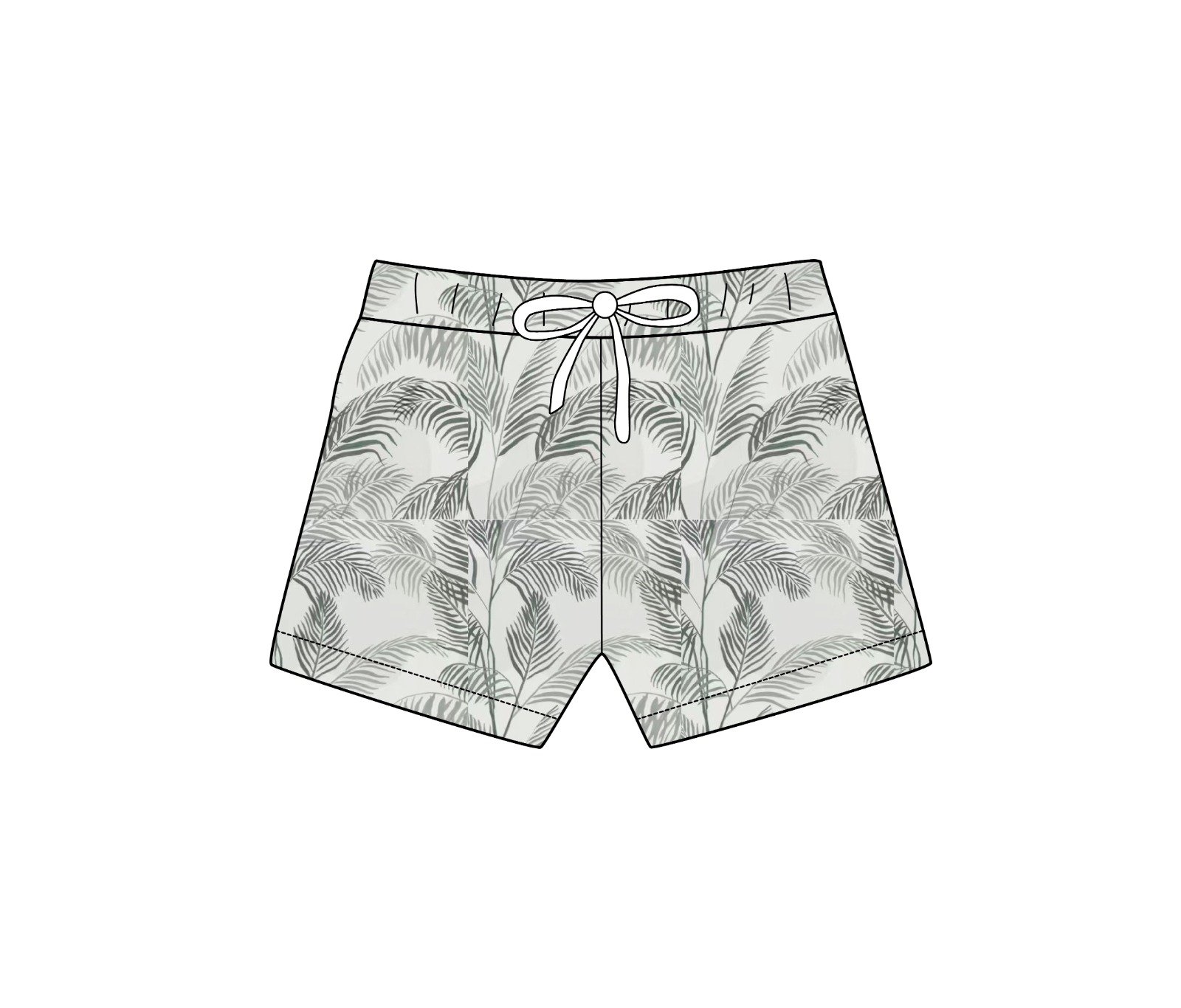 בגד ים מכנסון לגברברים הקטנים שלכם. מגיע ברקע לבן עם עיטורי עצי דקל בגווני ירוק כחלחל. עם שרוך במותן.
