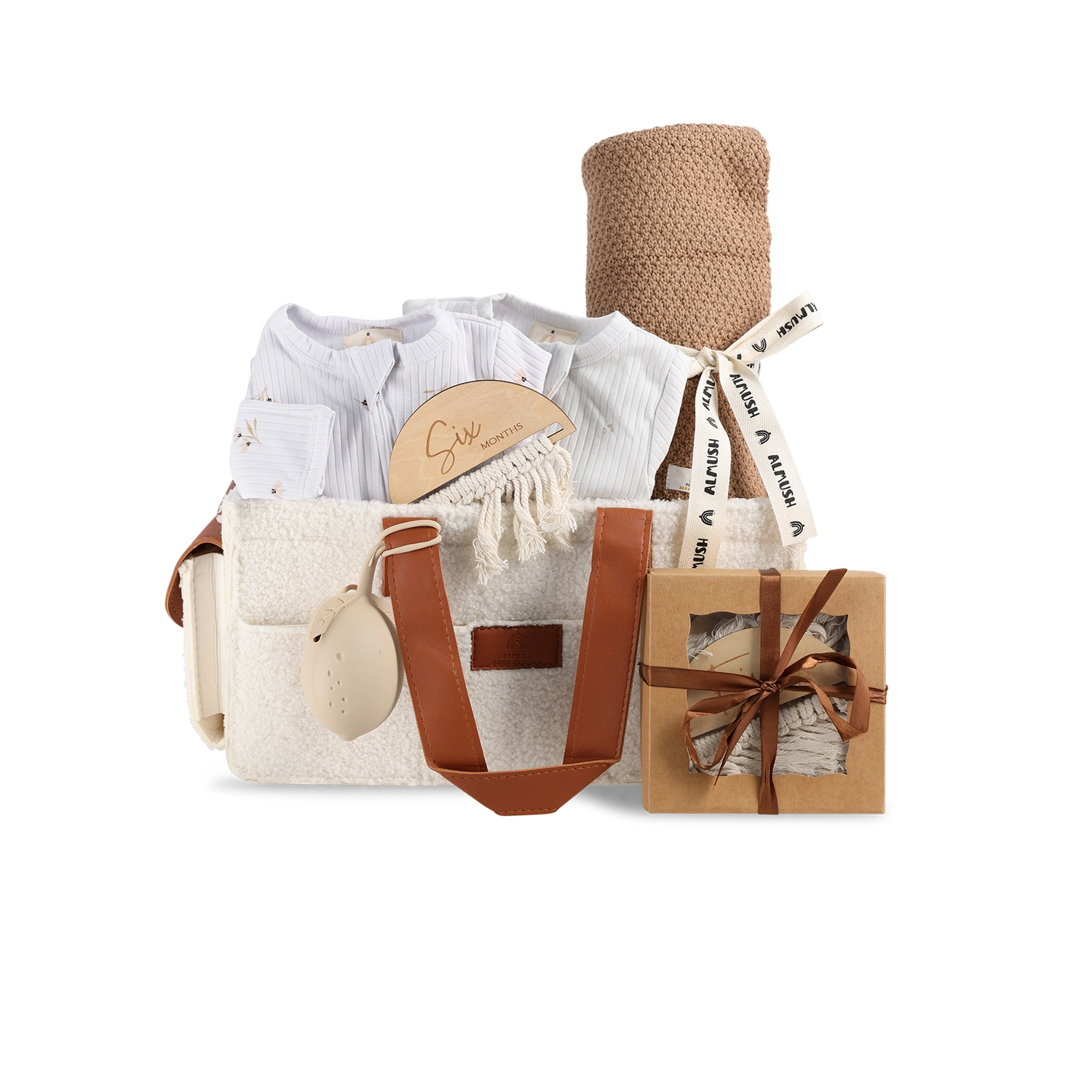 זוג אוברולים בד ריב עם רוכסן דו צדדי שמיכה סרוגה בגוון חום 120*80 נרתיק למוצץ מסיליקון דיסקיות צילום עד גיל שנה לבייבי
